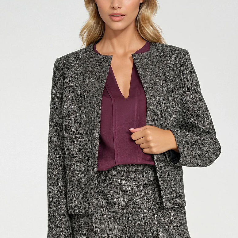 Une veste élégante pour femme, de coupe régulière et de forme courte et boxy, est le choix idéal pour les amateurs d'élégance avec une touche de modernité. Fabriqué dans un tissu à la texture chinée et de couleur non uniforme, il se présente de manière exceptionnelle et ajoute du caractère à chaque tenue. Ce modèle sans fermeture se distingue par un design minimaliste, et les épaulettes soulignent délicatement la silhouette, lui donnant une ligne plus nette. Pour un confort optimal et une finition esthétique, la veste est doublée à 100% de polyester. Elle se mariera parfaitement aussi bien avec des tenues élégantes que décontractées, leur ajoutant une touche de classe subtile et de style mode.
