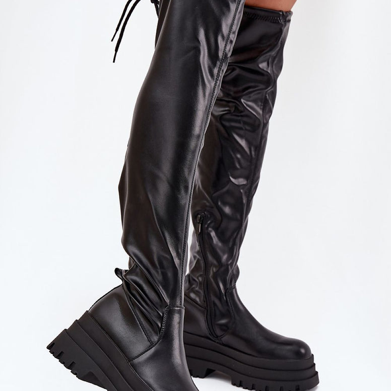Les bottes au genou montées sur une plateforme massive sont un excellent choix pour les jours d'hiver, alliant style et confort. Le modèle enfiler, avec une fermeture à glissière supplémentaire en bas de la tige, assure une mise en place facile et un ajustement parfait. En haut de la tige, il y a un cordon de serrage. Doublées uniquement au niveau du pied, elles garantissent chaleur et confort. Leur coupe tendance ajoutera du caractère à chaque tenue, en faisant un excellent complément aux tenues d'automne-hiver.