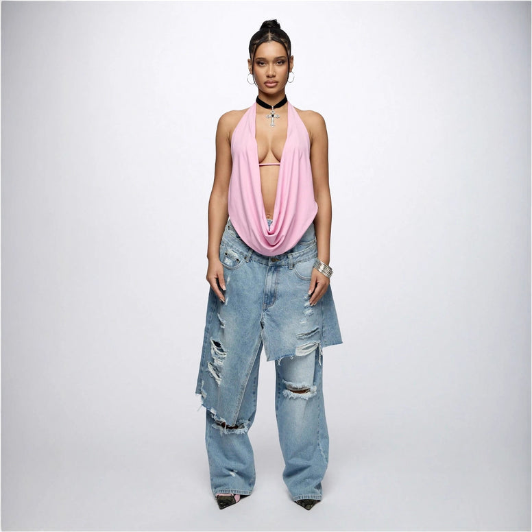 Affirmez votre style avec ce jean déstructuré à double taille ultra original. Son effet de superposition avec découpe asymétrique, ses larges déchirures et sa coupe oversize font de lui une pièce forte, parfaite pour un look streetwear percutant et audacieux. Inspiré des tendances Y2K et du hip-hop, ce pantalon casse les codes du denim classique.