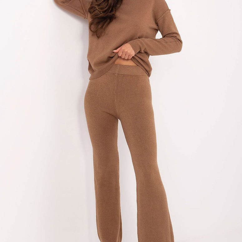 Ensemble décontracté pour femmes composé d'un pull et d'un pantalon, idéal pour tous les jours. Fabriqué dans un mélange doux et élastique de viscose, polyester et élasthanne, il assure confort, aisance et une coupe parfaite. Le pull a un col rond classique et des manches longues, ce qui le rend parfait pour les jours plus frais. Le pantalon à jambes larges et taille haute garantit une liberté de mouvement et un look moderne et élégant. Le motif lisse met en valeur le caractère polyvalent de l'ensemble, facile à assortir avec différents accessoires. Un choix pratique et élégant pour les femmes appréciant le mélange de confort et de simplicité intemporelle.