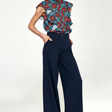 Un des styles de pantalons les plus à la mode de cette saison ! Pantalons bleu marine de style palazzo avec des jambes évasées. Le modèle a des poches pratiques.