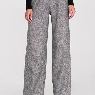 Pantalon élégant pour femme de coupe relaxed fit, fabriqué dans un tissu à la texture chinée et à la couleur non uniforme qui leur donne un caractère moderne. Le modèle a une taille haute et des plis décoratifs à l'avant, soulignant subtilement la silhouette. Les jambes larges sont larges et longues, offrant confort et liberté de mouvement. Les pantalons ont des poches classiques à l'avant et la partie arrière de la taille est équipée d'un élastique pour ajuster les pantalons à la silhouette. Un détail supplémentaire est la large ceinture avec des boutons décoratifs, donnant à l'ensemble un caractère élégant et à la mode.