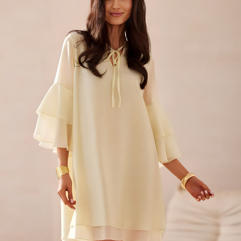 Robe Béatrice de coupe trapèze et longueur au-dessus du genou, fabriquée en Lyocell léger et respirant. Le modèle se caractérise par un décolleté en forme de V avec un col bas et des lacets. Les manches 3/4 se terminent par une double volant, donnant à l'ensemble légèreté. La robe peut être portée lâche ou cintrée à la taille avec une large ceinture du même matériau, ce qui permet de l'adapter à toutes les silhouettes.