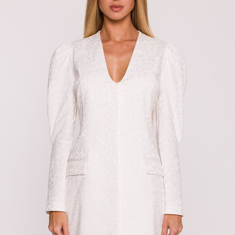 Une élégante robe en tissu jacquard avec un motif végétal légèrement bombé est une proposition qui allie classique et modernité subtile. Le matériau soigneusement choisi confère un caractère noble à l'ensemble, et la doublure sur toute la longueur assure un confort de port et un ajustement parfait du modèle. Le modèle a un profond décolleté en forme de V, qui affine joliment la silhouette et ajoute de la féminité. Les manches longues avec de délicates manches bouffantes en haut ajoutent de l'élégance et de la légèreté. La fermeture à l'avant, cachée sous un pli avec des boutons, souligne le caractère raffiné de la robe. Le tout est complété par des imitations de poches avec des rabats décoratifs, qui ajoutent une touche élégante à l'ensemble. La coupe ajustée, légèrement cintrée, souligne subtilement la silhouette, en combinant un haut clairement marqué avec un bas simple. La longueur mini donne à la tenue une expression moderne, la rendant parfaite pour les sorties du soir et les rencontres élégantes.