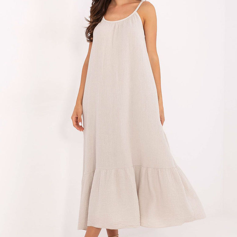 Robe légère, aérée et extrêmement confortable en mousseline de coton délicate, parfaite pour les journées chaudes et ensoleillées. Le tissu lisse et la coupe évasée créent une proposition élégante et décontractée pour tous les jours. Modèle de longueur midi, avec un décolleté rond et des bretelles à nouer qui permettent de régler et d'ajuster à la silhouette. Le bas de la robe est orné d'un volant spectaculaire qui ajoute de la légèreté et du charme féminin à l'ensemble. C'est un choix parfait pour les sorties quotidiennes, les promenades, les vacances ou les rencontres entre amis. Le tissu naturel et la coupe ample vous assureront un confort total même par temps de grande chaleur. La longueur de la robe est donnée sans les bretelles.