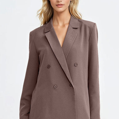 Une élégante veste de costume pour femme de coupe oversize est un incontournable dans une garde-robe moderne. Le col à revers lui donne un caractère classique, tandis que la fermeture à double boutonnage souligne le style intemporel et élégant. Le modèle est équipé de manches longues boutonnées et d'épaulettes qui sculptent joliment la silhouette et ajoutent une forme distinctive à l'ensemble. Sa longueur au niveau des hanches fait que la veste de costume se présente parfaitement dans des tenues décontractées ou plus formelles. Pour plus de confort et une finition esthétique, la veste est entièrement doublée. C'est une proposition élégante qui se marie parfaitement avec un jean, un pantalon en tissu ou une robe.