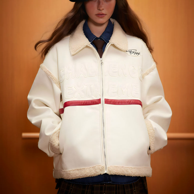 Adopte un style audacieux avec cette veste oversize sherpa inspirée des vestes universitaires américaines. Confortable, chaude et visuellement impactante, elle affiche le slogan "CHALLENGE EXTRÊME" en relief et une ligne contrastée rouge pour un look street vintage affirmé. Parfaite pour affronter l’hiver avec style et caractère.